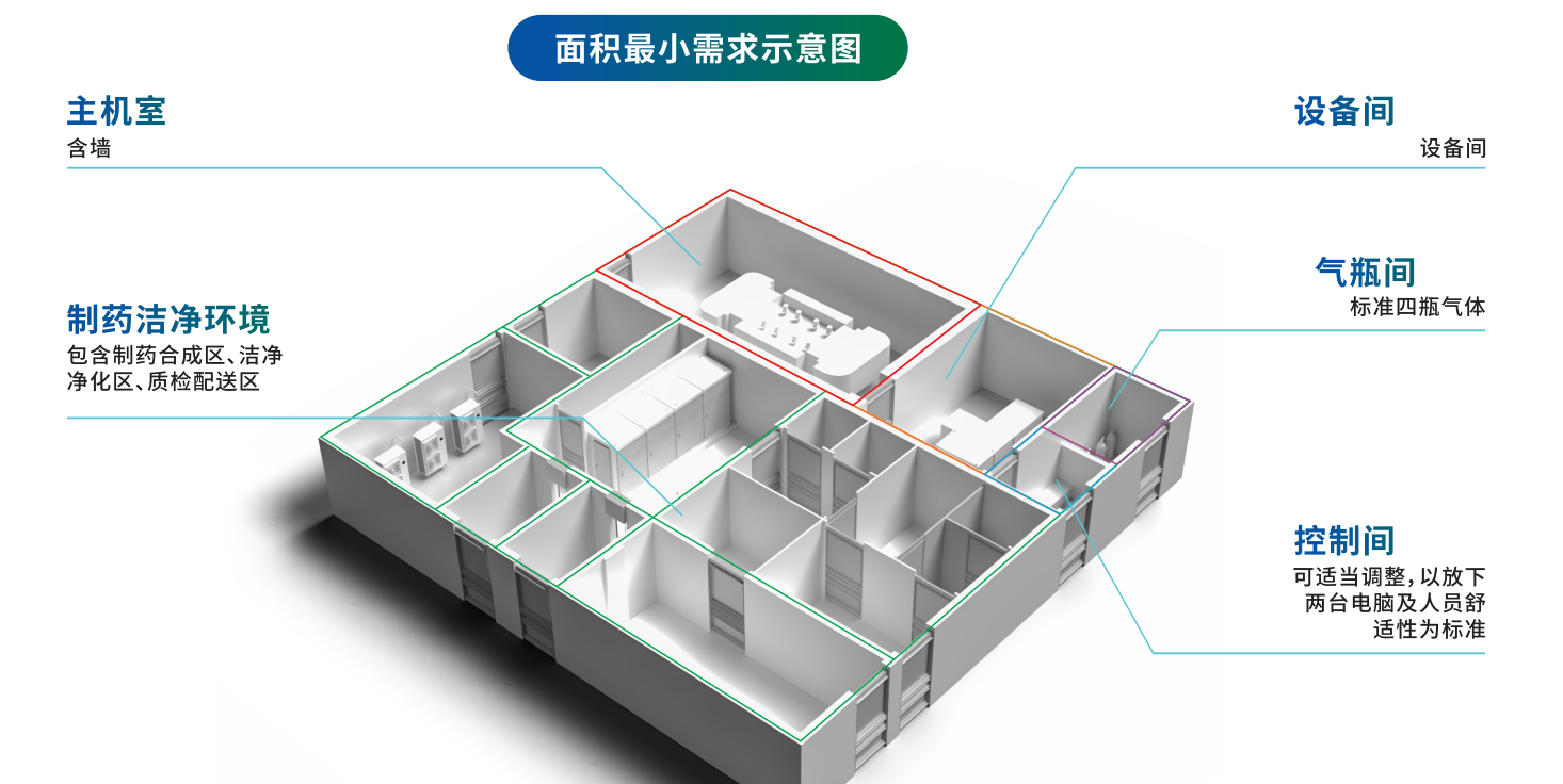 基本功能包含回旋加速器間、設(shè)備間、控制間、氣瓶間、制藥潔凈環(huán)境等。